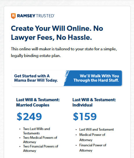 I have followed Dave Ramsey and trust him. My church sponsors his programs as well. His web site provides an easy and inexpensive way to create a will and power of attorneys. A lawyer will charge at least $500 for a will, and more for the Power of Attorney documents.